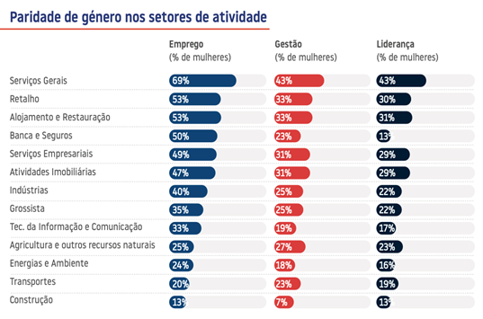 O estudo mostra que o desequilíbrio de género nas posições de decisão é transversal à economia portuguesa. Em nenhum setor de atividade as mulheres atingem os 50% de representação em cargos de gestão ou de liderança.