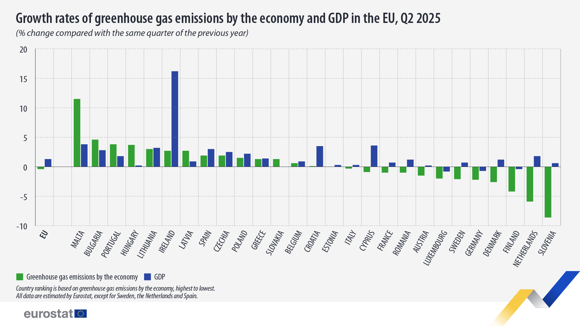 As emissões de gases com efeito de estufa da União Europeia (UE) recuaram para 772 milhões de toneladas de CO2 equivalente no segundo trimestre de 2025, uma descida marginal de 0,4% face ao mesmo período de 2024. No mesmo intervalo, a economia avançou: o PIB do bloco cresceu 1,3%. Por sua vez, Portugal ficou em terceiro entre os países que mais aumentaram as suas emissões, depois de Malta e Bulgária.