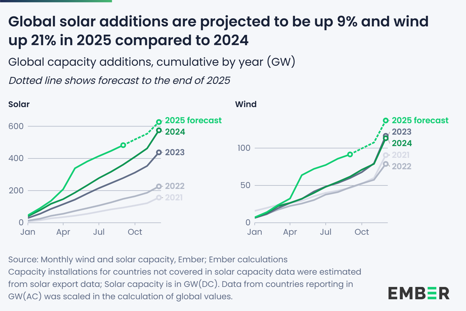 A transição energética global está a ganhar velocidade. De acordo com a Ember, em 2025 deverão ser acrescentados cerca de 793 gigawatts (GW) de capacidade renovável, um aumento de 11% face a 2024 e o terceiro ano consecutivo de forte crescimento. A expansão é liderada pela energia solar, com a China a representar dois terços das novas instalações solares e eólicas previstas.