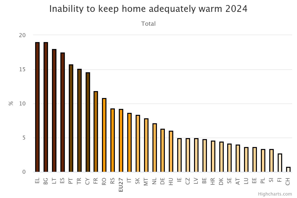Cerca de 15,7% da população em Portugal não consegue manter a sua habitação adequadamente aquecida, colocando o país entre os mais afetados pela pobreza energética na União Europeia (UE). De acordo com dados do Eurostat, Portugal ocupa o 5.º lugar no ranking europeu, ficando apenas atrás da Grécia e da Bulgária (ambas com cerca de 19%), da Lituânia (18%) e de Espanha (17,5%).
