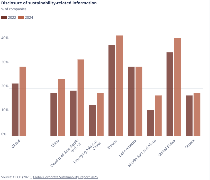 Entre as regiões analisadas, a Europa lidera, com 98% do valor das empresas a reportar informações ESG, seguida da Ásia-Pacífico desenvolvida (excluindo os EUA), com 94%, e dos próprios Estados Unidos, com 93%. Para a OCDE, esta tendência demonstra que as grandes empresas estão a assumir cada vez mais responsabilidades na divulgação de práticas sustentáveis, enquanto muitas pequenas empresas ainda ficam de fora.