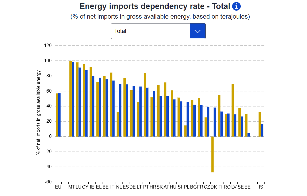 Apesar da média europeia, existem grandes diferenças entre países. Malta (98%), Luxemburgo (91%) e Chipre (88%) apresentam níveis muito elevados de dependência energética. Em contraste, Estónia (5%), Suécia (27%) e Letónia (29%) destacam-se pela menor dependência de importações. Os valores da vizinha Espanha situam-se nos 68,9%.